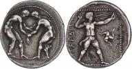 AR Statér, dva zápasníci / muž s prakem zprava, triskeles, nápis, podobný jako SG.5390, 10.900g, mírně exc., pěkná patina