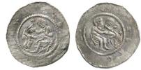 Denár C - 593 ac - značka "E" v poli chybí, kulička mezi sedící mi postavami_opis ned.