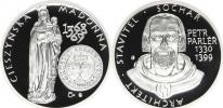 "Cieszynska Madona", socha Madony s dítětem, vpravo těšínský groš s dataci 2008 / Petr Parléř 1330-1399, architekt-stavitel-sochař, portrét enface (autor Roman Chmel) razila ČM Ag 999 34 mm16 g (1 000 ks) kapsle