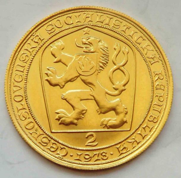 Zlatý 2 DUKÁT 1978. Dukát byl vydán k 600. výročí úmrtí Karla IV. Au 986, 6,98 g, 25 mm. Vroubkovaná hrana, mincovna Kremnica. Náklad pouze 4898 kusů! Málo znatelná hranka, jinak bezvadný stav.