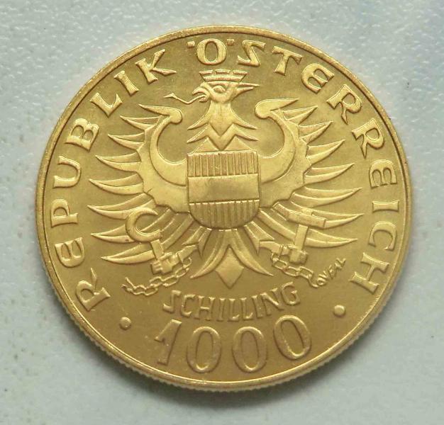 Zlatý Rakouský 1000 Schilling z roku 1976 - 1000 let Babenbergů. Au 900 - 13,5 g - 27 mm - síla 1,6 mm - vroubkovaná hrana. Krásný stav - ražební lesk.