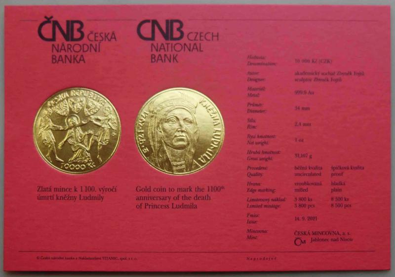 Zlatá mince ČR Kněžna Ludmila, vydaná v roce 2021 v provedení špičková kvalita Proof. Au 999,9 (24 karátů) - 31,1 g (1 Oz) - 34 mm - hladká hrana. K minci dodám originální etuji a certifikát ČNB. Vše je v bezvadném stavu.