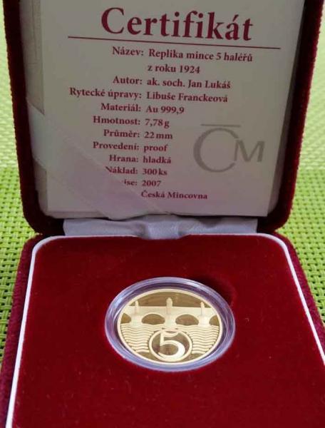 Replika Československé mince 5 haléřů z roku 1924. Au 999,9/1000, průměr 22 mm, váha 7,78 g. Náklad pouze 300 kusů. K minci dodám originální etuji a certifikát. Vše je v bezvadném stavu.