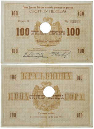 100 perper 1914, s. B. Pick-14, Barac-C16a. 1x skart. otvor, v ohybu 10 mm natržená R
