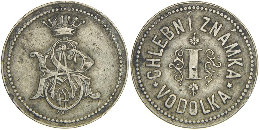 Odolená Voda (okr. Praha - východ). Chlební známka Vodolka. CuNi 24 mm. Lit.: Mlýn. a pekárenský průmysl 7-8/1998, str. 237, č. 6