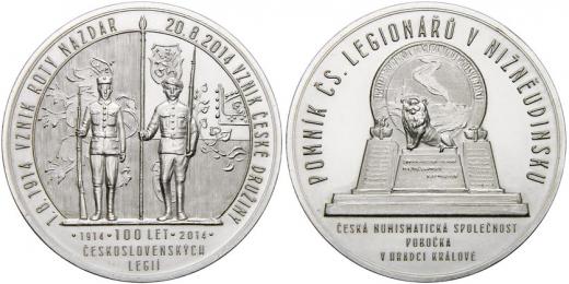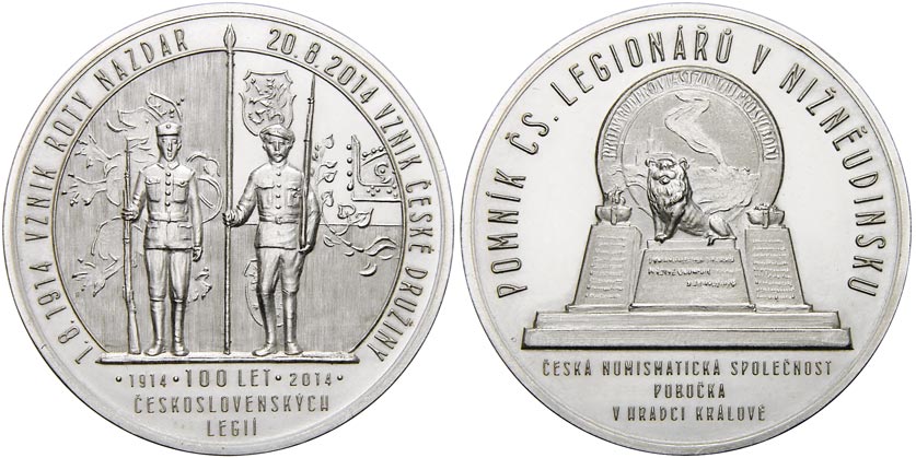 100 let čs. legií 1914 - 2014. Dva legionáři s puškami, v pozadí vlajky, nápis a opis / legionářský pomník v Nižněudinsku, opis a nápis. Sign. Soušek. Ag (puncy) 0.999 35 mm, 31,52 g, číslováno (č. 25/50), raženo 50 ks. FM-nové R