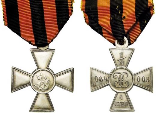 Rusko (do r. 1918). Vojenský kříž sv. Jiří, IV. st., typ 1916, čísl. (č. 064006), zn. БM. Bílý kov, pův. ráhnová stuha. Čep.-1037