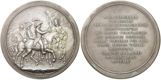Arcivévoda Karel Ludvík Rakouský (1771-1847). Medaile na vítěznou bitvu u Aspern 22.5.1809. Arcivévoda na koni dává čutoru vojákovi po bitvě / 12-ti řádkový nápis. Sign. Harnisch. Ag 76 mm (160,64 g). Mont.-jako 2364. skvrny, n. vada mat. na rubu (v nápisu) R