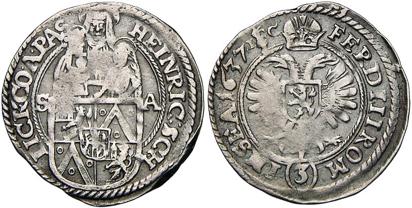 3 krejcar 1637 IC Planá - Candler (20,6 mm, 1,52 g). Don.-3812, Pavlíček-nezná (s nom. hod. 3). dr. nedor.