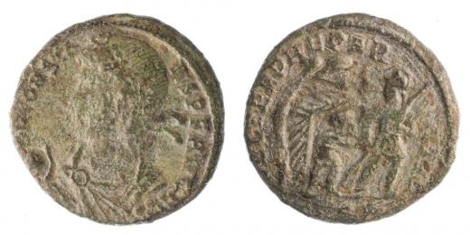 Constans 337-350 maiorina R:voják se zajatcem před chýší Sear 3876