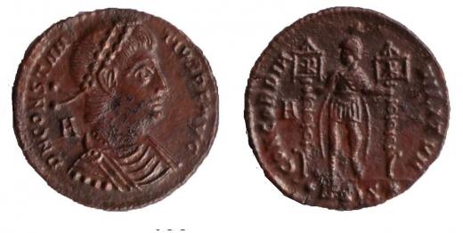 Maiorina, L: poprsí zprava, DN CONSTAN - TIVS PF AVG, R: stojící Concordia s 2 standartami, CONCORDIA MILITVM, H, Siscia, 4,8 g.