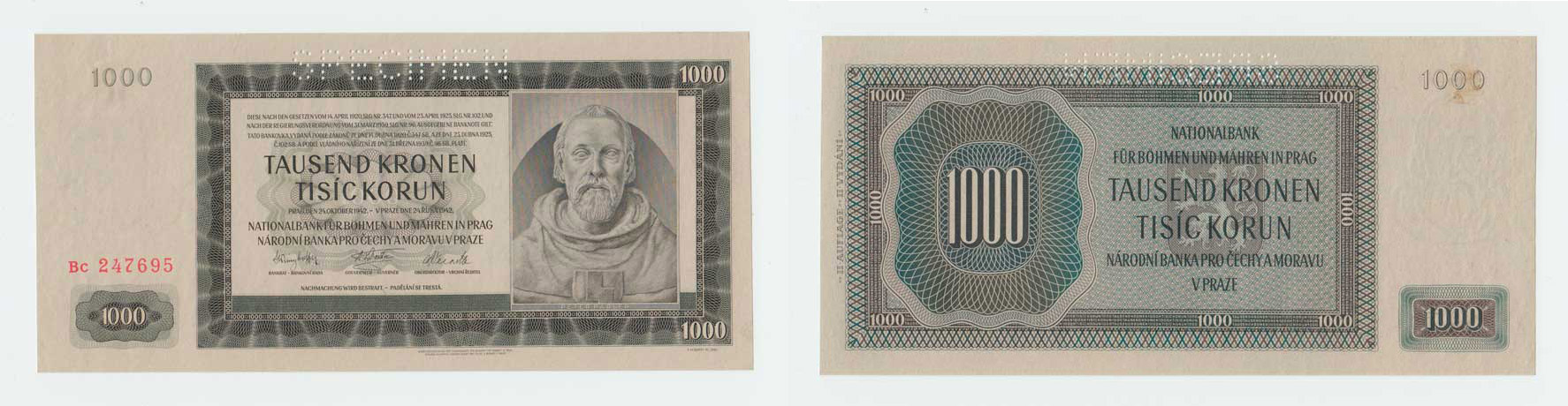 1000 Koruna 1942 - 3.vyd.- sér.Bc, BHK.39b, He.41b.s1, stopy po lepu "SPECIMEN"