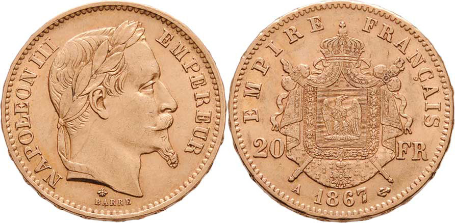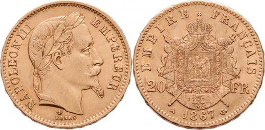 20 Frank 1867 A, Paříž, KM.801.1 (Au900), 6.450g, nep.hr., nep.rysky, pěkná patina