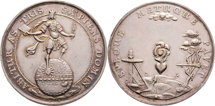 Medaile na životní moudrost b.l. - Kristus jako král na globu, opis / symboly Víry, Lásky a Naděje, opis, Sign.IB, Ag 38mm, 16.180g, dr.hr., dr.rysky, pat. R!