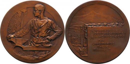 Neubauer - obchodní a živnostenská komora b.l.- kovář u kovadliny, vavříny, přístav / pohled na město, vavříny, nápis, Sign., patinov.bronz 60 mm, 84.884g