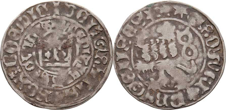 Pražský groš, Kut.Hora - Hanuš z Řásné, Há.XIII.e/2 - varianta - tečky v obou smyčkách ocasu, 2.686g, nep.nedor., skvrnky, patina R!
