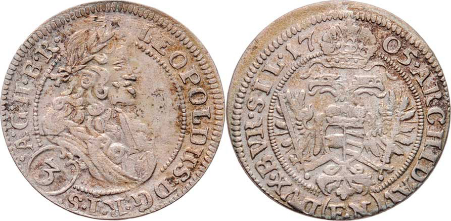 3 Krejcar 1705, Vratislav-Nowak, Nech.752/753-var., MKČ.1631, 1.648g, v Rv. mírně exc., pěkná patina