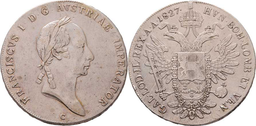 Tolar konvenční 1827 C, Praha, 28.049g, nep.just., dr.stopa po oušku, dr.hr., dr.rysky, pěkná patina