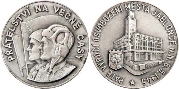 Jarý - páté výročí osvobození Jablonce 8.5.1950 - dva vojáci, prapory, opis / radnice, znak Jablonce, opis, Sign., Punc., patin. Ag835, 50mm, 51.475g, BK.1