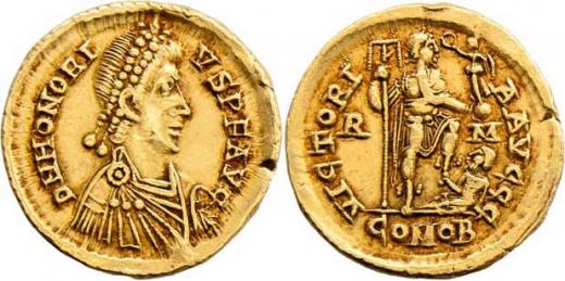 Solidus, Rv:"VICTORIA.AVGGG.R.M." stojící císař se standardou a Victorií šlape na zajatce, S.4144, RIC.1252 - Řím - období 404 - 408, 4.429g, patina R!