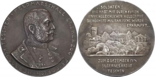 Helene Scholz - AR pam. medaile 1914 - poprsí zprava, opis / těšínský zámek s parkem, 8-řádk.nápis, Sign., Punc., Ag 55mm, 71.126g, dr.hr., nep.rys., patina R!