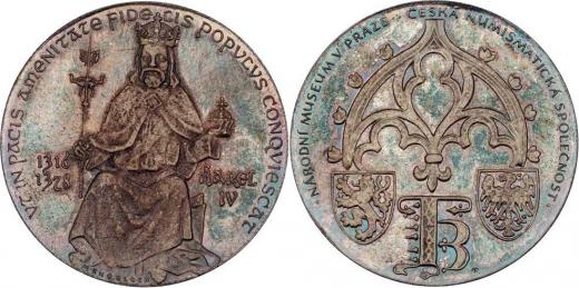 Knobloch - 600.výročí úmrtí Karla IV. 1978 - trůnící císař čelně, písmo / gotické "K", znaky, kružba, opis, Sign., Punc., pat. Ag900, 40mm, 30.976g, patina