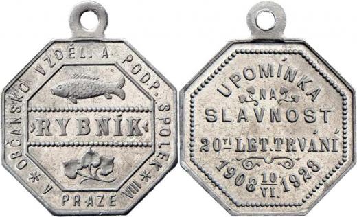 Rybník - obchodní, vzdělávací a podpůrný spolek 1908 / 1928, Nesign., hliníkový osmiúhelník 26x26 mm s původním raženým ouškem