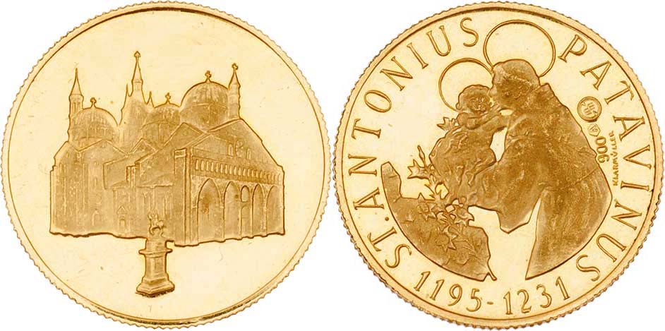 Svatý Antonín Paduánský, opis / chrám v Padově, Sign.Klarmüller, Punc. Au900, 20mm, 3.472g