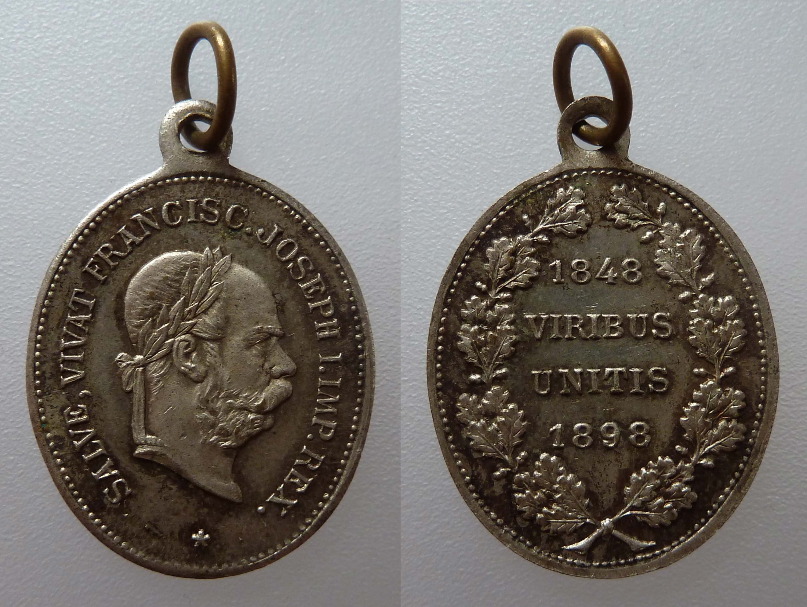 Nesign. - oválná medailka na císařské jubileum 1898 - poprsí zprava, latin. opis / 4-řádk. latin. nápis ve věnci, postř. mosaz 24/28 mm s původ. raženým ouškem