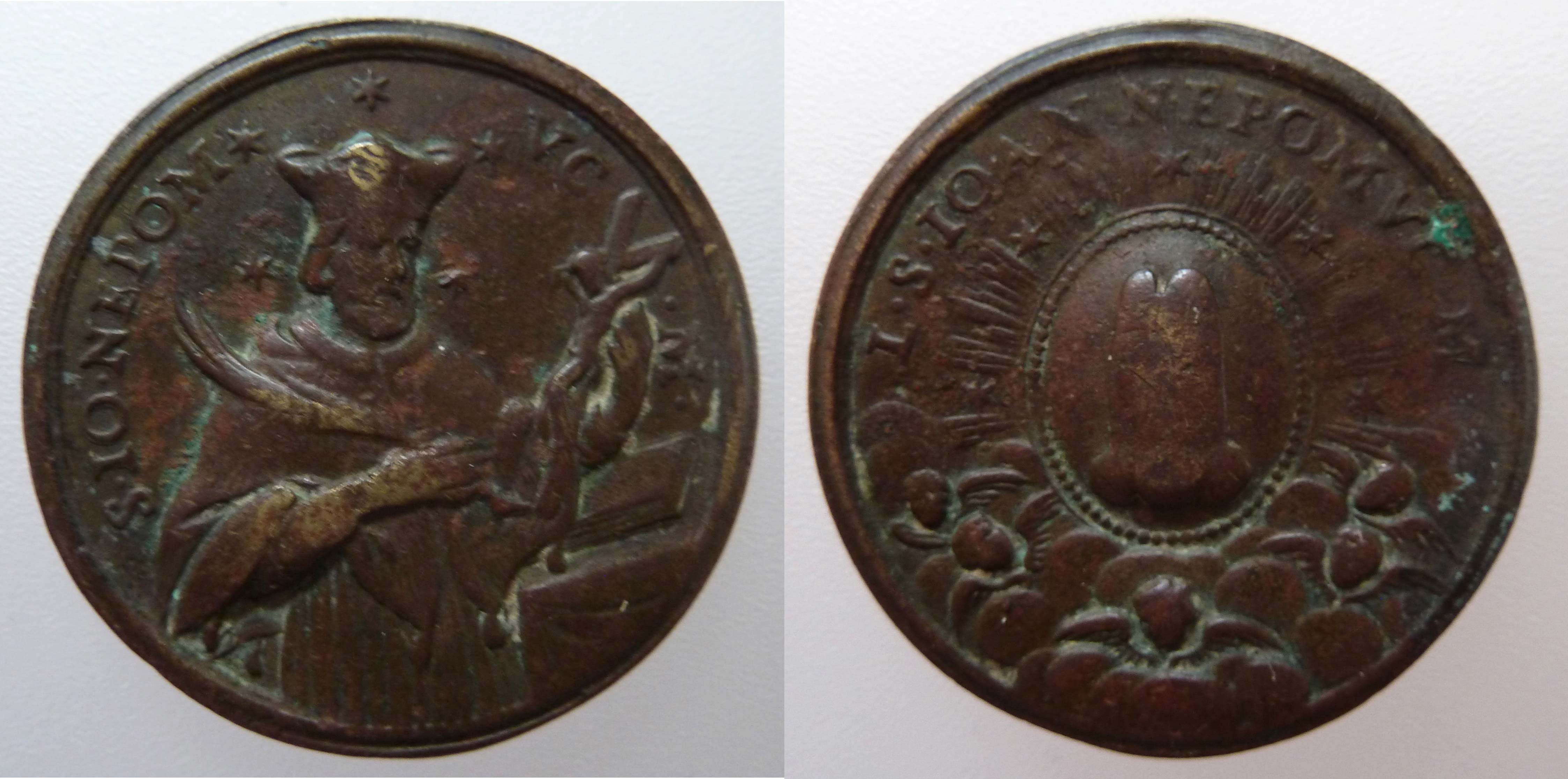 Sv. Jan Nepomucký, opis / zářící zázračný jazyk na vypouklém štítu, andílci, oblaka, opis, mosaz 35mm, 17.982g, Přib.607, stopa po oušku, skvrny, patina