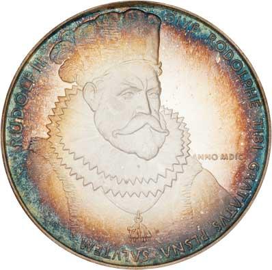 L.Kozák - 700 let Plzně - Rudolf II. 1990 - poprsí částečně zprava, opis / radnice, socha, písmo, Ag900, 60mm, 109.756g, FM.10 (pouze 25 ks), patina, etue RR!