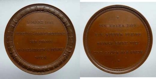 Vídeň - 50.výročí založení firmy Elsinger 5.3.1881 - 5-řádkový nápis ve věnci / 4-řádk. nápis, hvězdičky, Sign., bronz 63 mm, pěkná patina