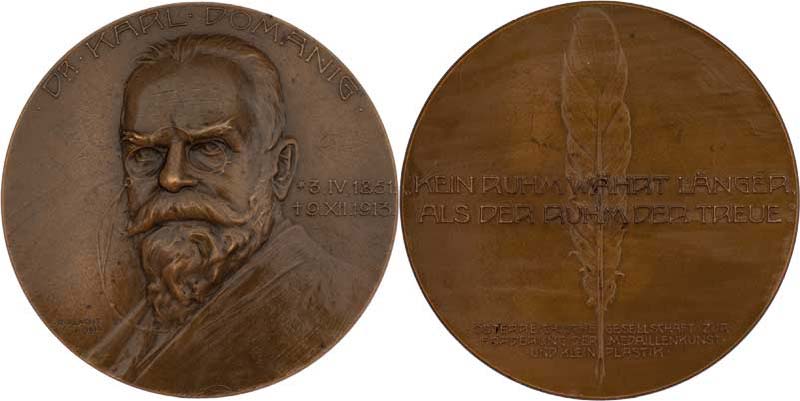 Dr.Karl Domanig, numismatik - úmrtní medaile 1914 - poprsí zpředu, opis a nápis / brk a 5-řádkový nápis, Sign., lakovaný patinovaný bronz 75 mm, téměř