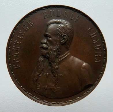 Frant. Rudolf Chaura - medaile na 50.narozeniny 1892 - poprsí zleva, opis / tabulka s latinským heslem, lip.ratolest, opisy, Sign.Golčmid, měď 34 mm, patina