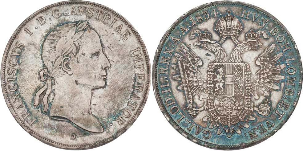 Tolar 1834 A, 27.949g, hrany, dr.úhozy, rysky, pěkná patina R!
