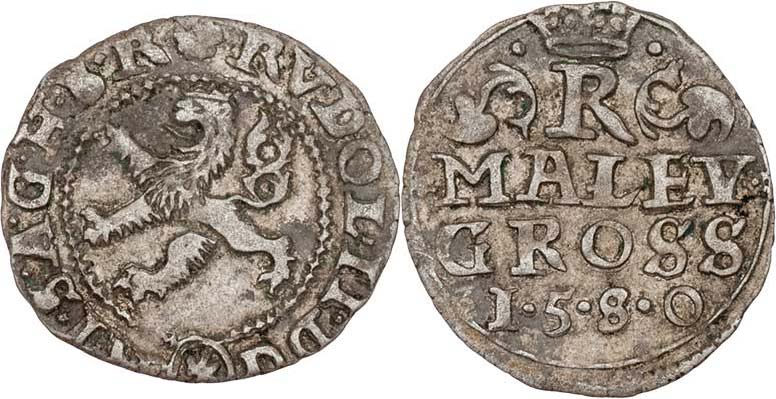 Malý groš 1580, K.Hora-Šatný, HN.2b (opis 7a), nápis "* MALEY */ GROSS / 1.5.8.0 ", 1.093g, nep.exc., nep.nedor., pěkná patina