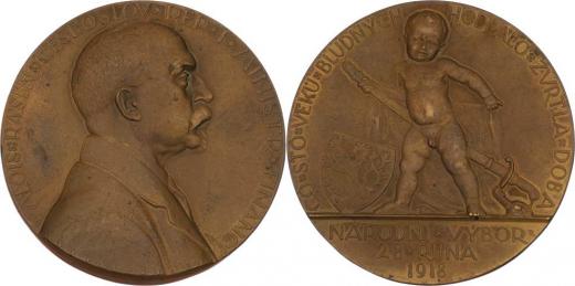 Alois Rašín - první ministr financí ČSR 1922 - poprsí zprava, opis / putti se šavlí a vlajkou, malý státní znak, opis a nápis, patin.bronz 60mm, 396ks, téměř