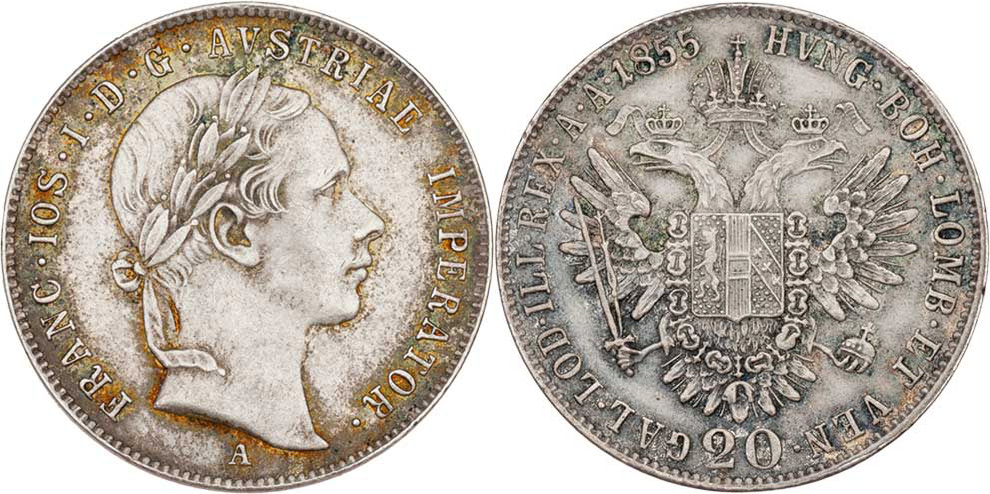 20 Krejcar 1855 A, 4.296g, skvrnky, patina
