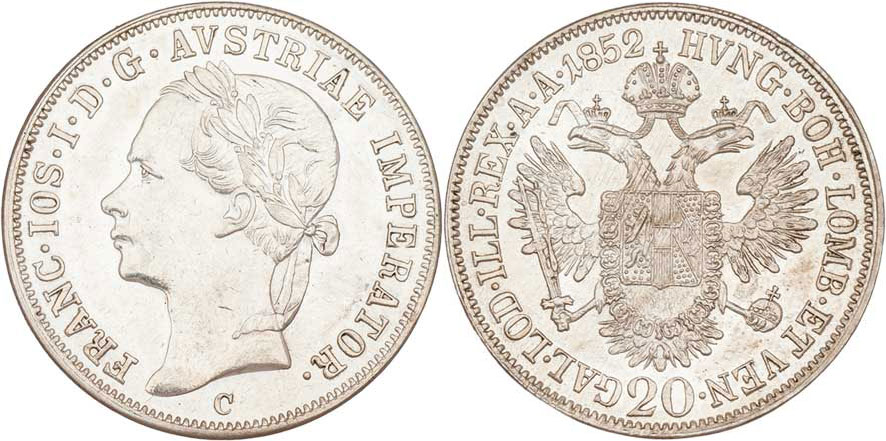 20 Krejcar 1852 C - hlava zleva, 6.686g, nep.just., nep.rysky R!