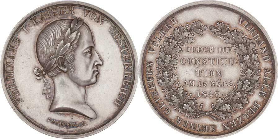 Schmitt - AR medaile na vydání ústavy 15.3.1848 - poprsí zprava, opis / 5-řádkový nápis v dubovém věnci a opis, Sign., 44mm, 34.994g, M.2630, H.3655, patina