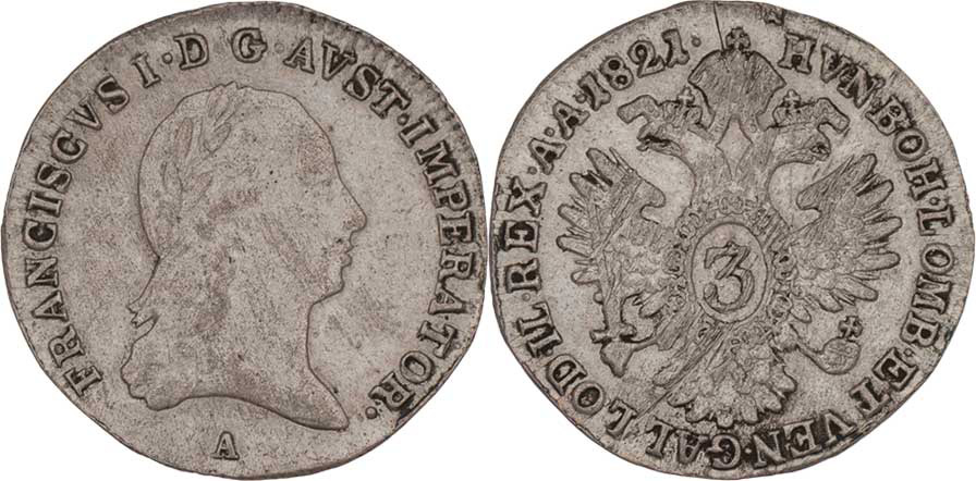 3 Krejcar 1821 A, 1.752g, mírně just., pěkná patina