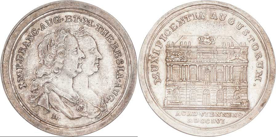 Doner - AR medaile na otevření vídeň. university 1756 - dvojportrét zprava, opis / průčelí university, písmo, 29mm, 8.667g, M.1845, H.2912, rysky, patina
