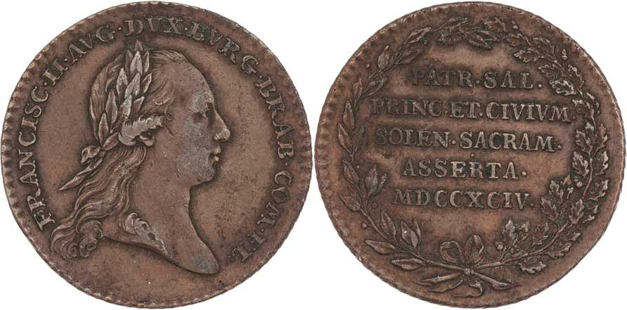 AE větší jeton na holdov. ve Flandrech 1794 - poprsí zprava, opis / pětiřádkový nápis ve věnci, Nesign., 28mm, 7.389g, Nov.M.5b, LG.XIV.1104, nep.rys., patina