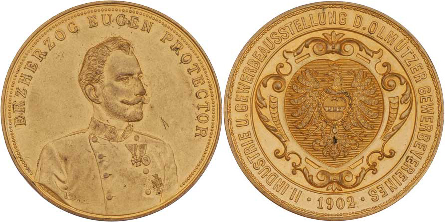 Ingr - II. průmyslová a živn. výstava v Olomouci 1902 - poprsí zprava, německý opis / znak města v kartuši, německý opis, Sign., zlacený bronz 50 mm, dr.škr.