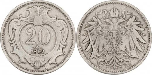 20 Haléř 1892, 3.895g, dr.hr., dr.rysky, patina R!
