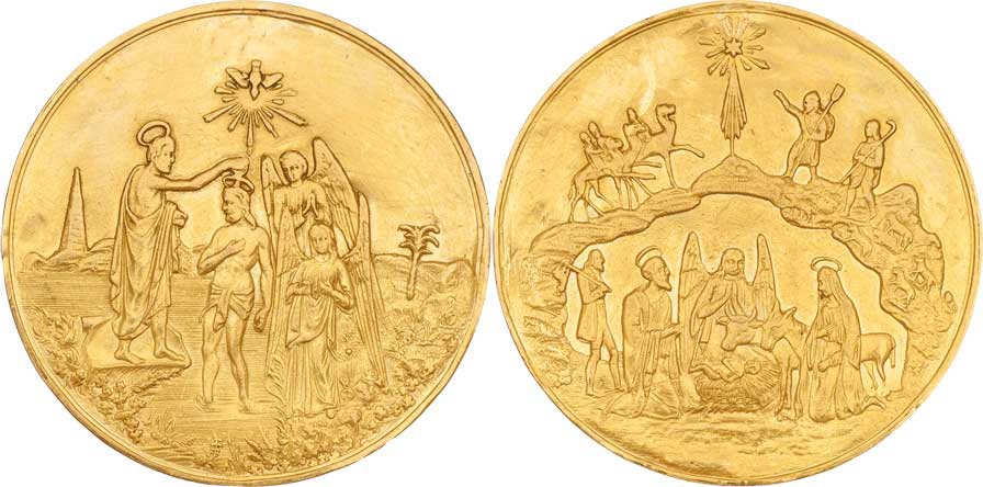 Křestní medaile b.l.(cca 19.stol.) - narození Krista, pastýři, tři králové / sv.Jan křtí Krista v Jordánu, 41mm, 12.513g, zalet.dírka, zvlněná, rysky, patina R!