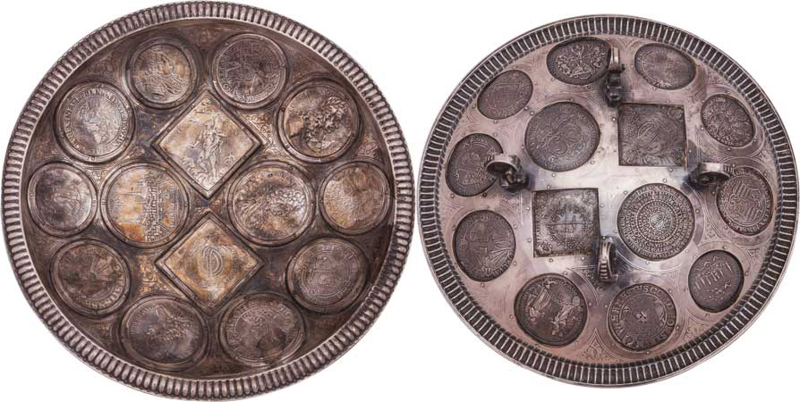 Stříbrný talíř na ovoce zdobený 2 českými tolary, 10 německými tolary a dvěma tolarovými klipami, 23cm, 678g, krásná patina RR!