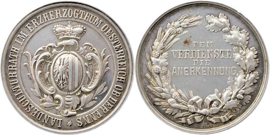 Horní Rakousy - Zemská kulturní rada - Uznání zásluh b.l. - zemský znak v kartuši, opis / 4-řádkový nápis ve věnci, Sign., Ag 39mm, 29.453g, vlas.rysky, patina