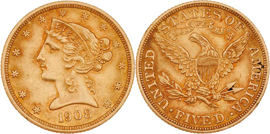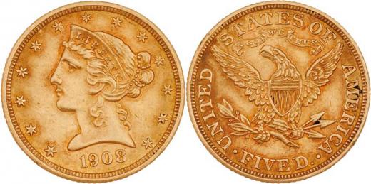 5 Dolar 1908 - hlava Liberty, KM.101 (Au900), 8.359g, nep.hr., nep.rysky, pěkná patina, téměř