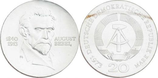 20 Marka 1973 - A.Bebel, KM.46 (Ag800, 100.000 ks), 20.882g, skvrnky, patina, téměř